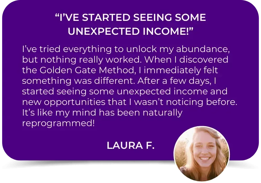 With the purchase of Golden Gate Method, you get immediate access to the complete audio program designed to help you reprogram your mind toward a natural state of abundance and prosperity, without requiring complex techniques or mental effort. With your purchase you also get acces to 4 exclusive bonuses for free.